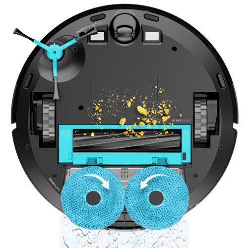 • Limpieza total de una pasada. Aspira, barre, friega y desincrusta con sus mopas Spin. Un equipo de limpieza completo que permite al robot hacer todo a la vez o por separado para ofrecer una limpieza a medida.
