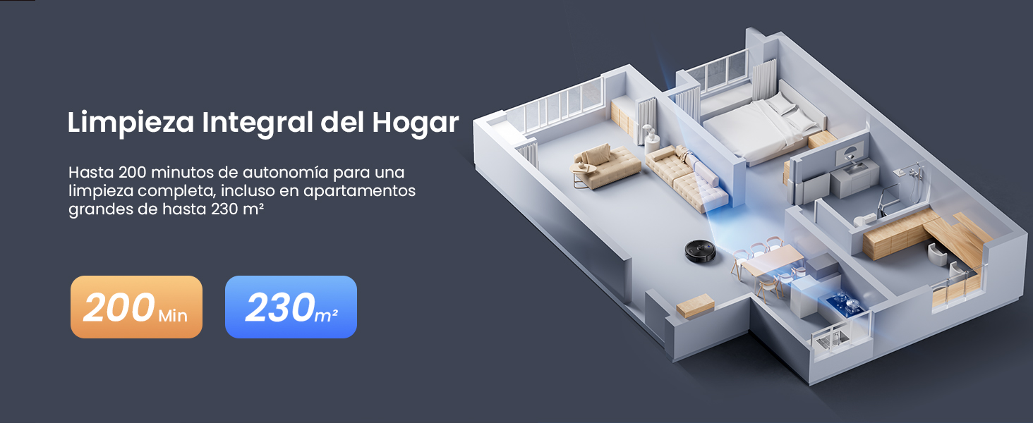 Puede limpiar casas grandes (hasta 230 m²) de una sola vez. Si se queda sin batería, vuelve solo a la base, se recarga y continúa justo donde lo dejó.