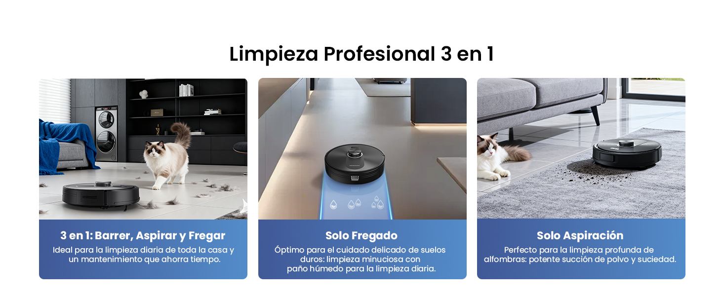 Ahorro de tiempo. El usuario no tiene que pasar la mopa manualmente después de aspirar. Además, permite ajustar el nivel de flujo de agua desde la app según el tipo de suelo (madera, baldosa, etc.).